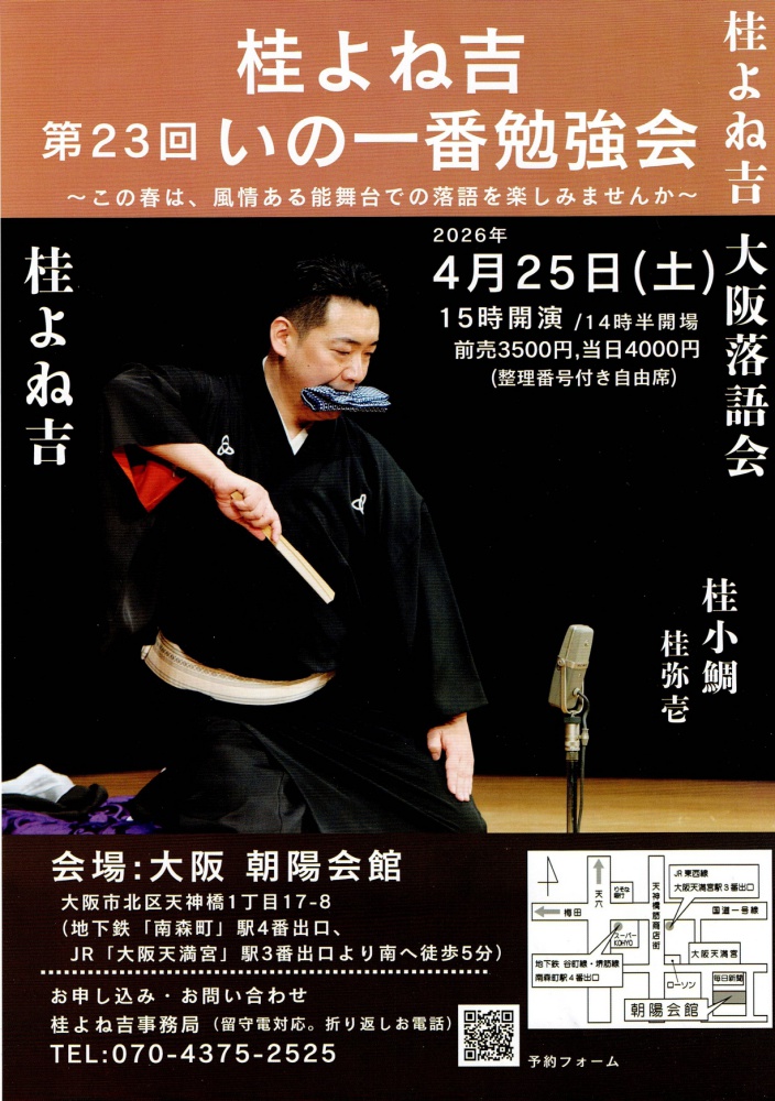 ご予約・お問い合わせ:桂よね吉事務局(留守電対応。折り返しお電話)またはチラシのQRにて
